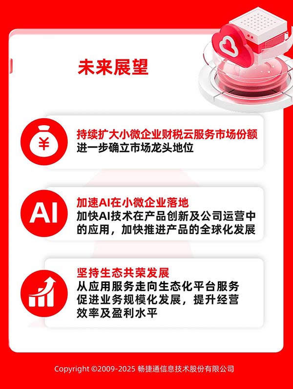 未來(lái),暢捷通將持續(xù)擴(kuò)大小微企業(yè)財(cái)稅云服務(wù)市場(chǎng)份額,進(jìn)一步鞏固小微企業(yè)財(cái)稅云服務(wù)市場(chǎng)龍頭地位,搶占小微企業(yè)云服務(wù)市場(chǎng)龍頭地位,堅(jiān)定秉持客戶成功原則,持續(xù)提升產(chǎn)品競(jìng)爭(zhēng)力,加快推進(jìn)產(chǎn)品的全球化發(fā)展。與此同時(shí),暢捷通將加速AI在小微企業(yè)落地,加快AI技術(shù)在產(chǎn)品創(chuàng)新及公司運(yùn)營(yíng)中的應(yīng)用,堅(jiān)持生態(tài)共榮發(fā)展,從應(yīng)用服務(wù)走向生態(tài)化平臺(tái)服務(wù),促進(jìn)業(yè)務(wù)規(guī)?;l(fā)展,提升經(jīng)營(yíng)效率及盈利水平。