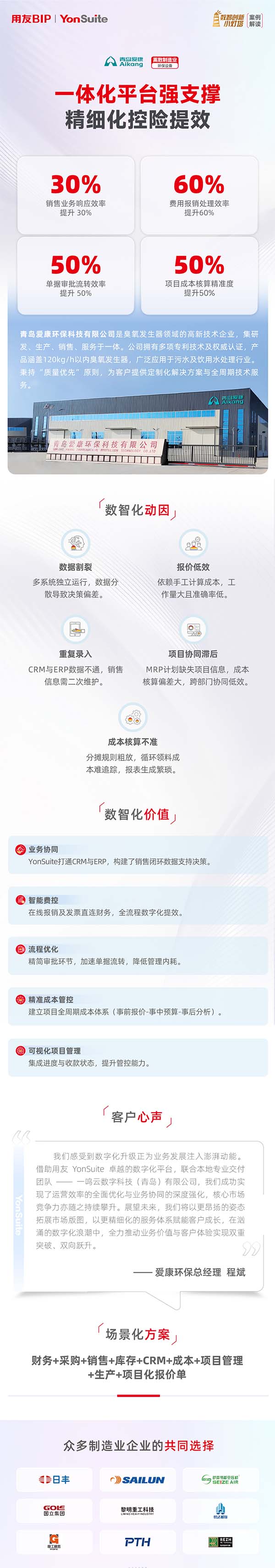 “臭氧發(fā)生器的核心是‘精準’—— 精準的臭氧濃度、精準的反應時間,才能保證水質安全。企業(yè)管理也是如此,只有精準的成本管控、高效的協同效率,才能支撐企業(yè)持續(xù)發(fā)展。” 愛康環(huán)??偨浝沓瘫笤谡劶稗D型時感慨道,“YonSuite 為我們注入了‘精準基因’,讓成本可量化、流程可追蹤、決策有依據。未來,我們將以更精細化的管理和更可靠的產品,讓每一臺臭氧發(fā)生器都成為客戶信賴的‘水質衛(wèi)士’。”