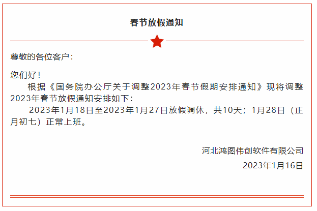 首頁 > 石家莊用友軟件 > 2023年鴻圖偉創(chuàng)-用友軟件春節(jié)放假及值班安排