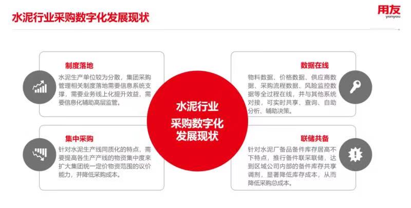 用友以企業(yè)采購數智化變革研究為基礎,針對水泥行業(yè)進行專項分析,發(fā)布用友BIP水泥行業(yè)采購及供應鏈解決方案。