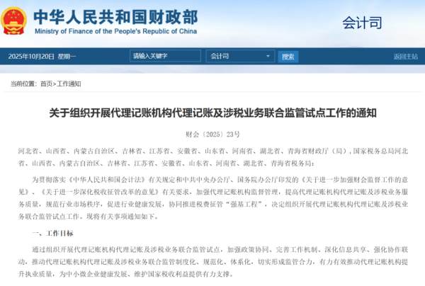 日前,財(cái)政部與國(guó)家稅務(wù)總局聯(lián)合發(fā)布《關(guān)于組織開展代理記賬機(jī)構(gòu)代理記賬及涉稅業(yè)務(wù)聯(lián)合監(jiān)管試點(diǎn)工作的通知》(財(cái)會(huì)〔2025〕23號(hào)),決定在河北、內(nèi)蒙古、江蘇等10個(gè)省份開展代理記賬機(jī)構(gòu)聯(lián)合監(jiān)管試點(diǎn)。