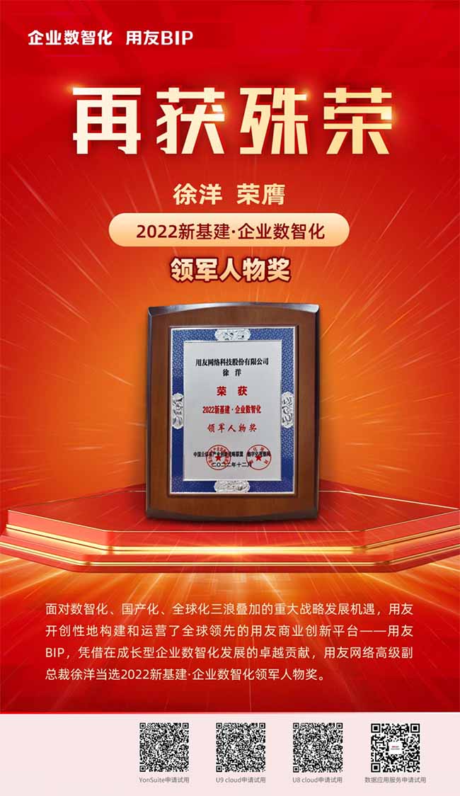 今年1月,國務(wù)院印發(fā)的《“十四五”數(shù)字經(jīng)濟(jì)發(fā)展規(guī)劃》明確提出,到2025年,數(shù)字經(jīng)濟(jì)核心產(chǎn)業(yè)增加值占國內(nèi)生產(chǎn)總值比重達(dá)到10%;展望2035年,力爭形成統(tǒng)一公平、競爭有序、成熟完備的數(shù)字經(jīng)濟(jì)現(xiàn)代市場體系,數(shù)字經(jīng)濟(jì)發(fā)展水平位居世界前列。依托國家政策紅利,面對數(shù)智化、國產(chǎn)化、全球化三浪疊加的重大戰(zhàn)略發(fā)展機(jī)遇,用友開創(chuàng)性地構(gòu)建和運(yùn)營了全球領(lǐng)先的用友商業(yè)創(chuàng)新平臺——用友BIP,憑借在成長型企業(yè)數(shù)智化發(fā)展的卓越貢獻(xiàn),用友網(wǎng)絡(luò)高級副總裁徐洋當(dāng)選2022新基建·企業(yè)數(shù)智化領(lǐng)軍人物獎(jiǎng)。